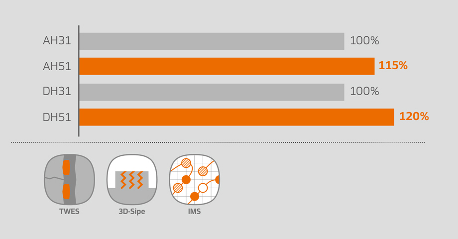 Las llantas premium Hankook se fabrican con un diseño de carcasa robusta y caucho reesculturado adicional en la banda de rodadura para ofrecer una segunda vida útil de la llanta reesculturada y una tercera vida recauchutada.