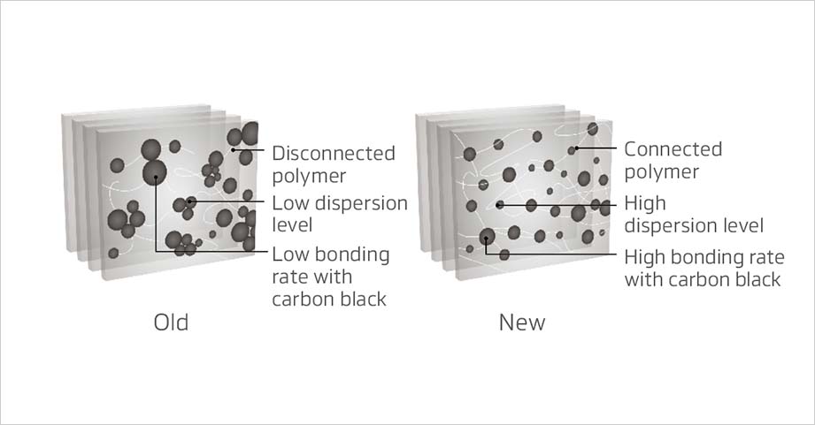 Innovative Mixing System (IMS) minimises the breakdown and oxidation of polymer chains and has a higher dispersion degree of carbon black. The effects of IMS help to strengthen the bonding force between the carbon black and rubber to ensure longer mileage and to lower the heat generation of compounds for improved fuel efficiency.